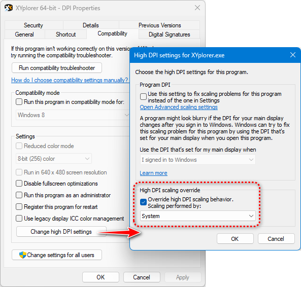 可以通過更改 XYplorer.exe 或其快捷方式的屬性來顯著改善此問題。右鍵點擊文件或快捷方式並選擇"屬性",然後打開"兼容性"選項卡並點擊"更改高 DPI 設置",然後勾選"替代高 DPI 縮放行為"並在"縮放執行者"下選擇"系統"。