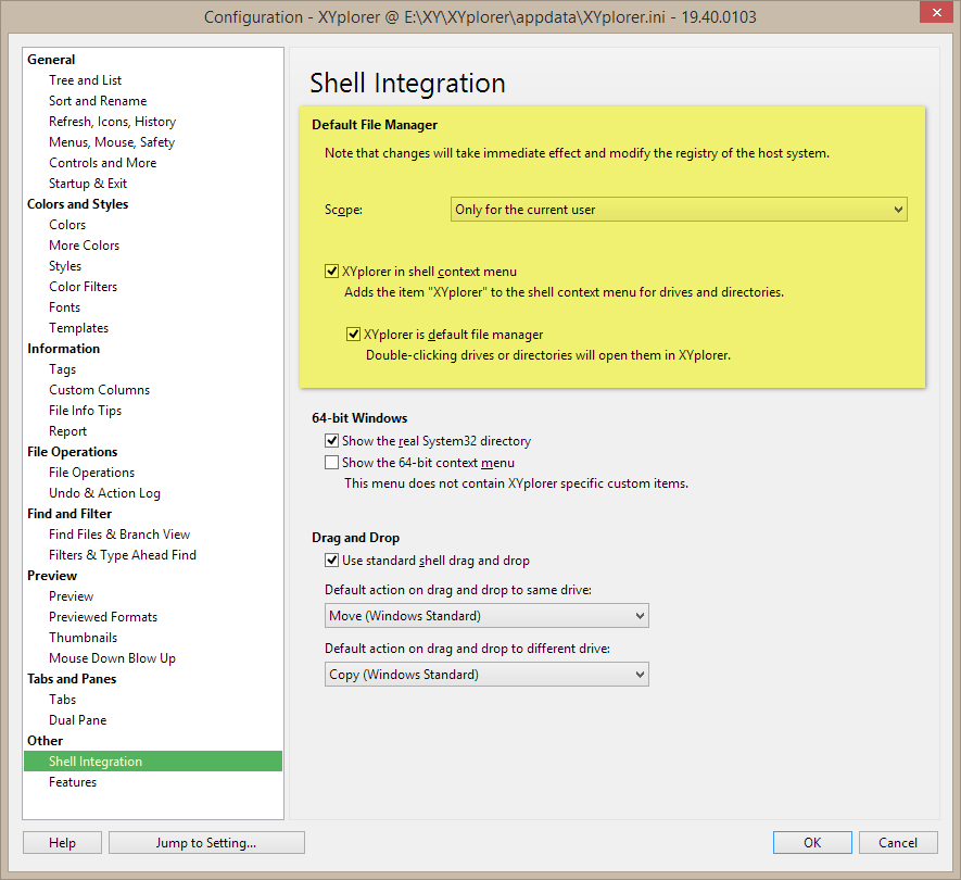 如果您使用的是便攜式安裝,請注意 64 位版本與 32 位版本的設定檔完全兼容。只需覆蓋可執行文件(XYplorer.exe 和 XYcopy.exe)即可無縫繼續使用。