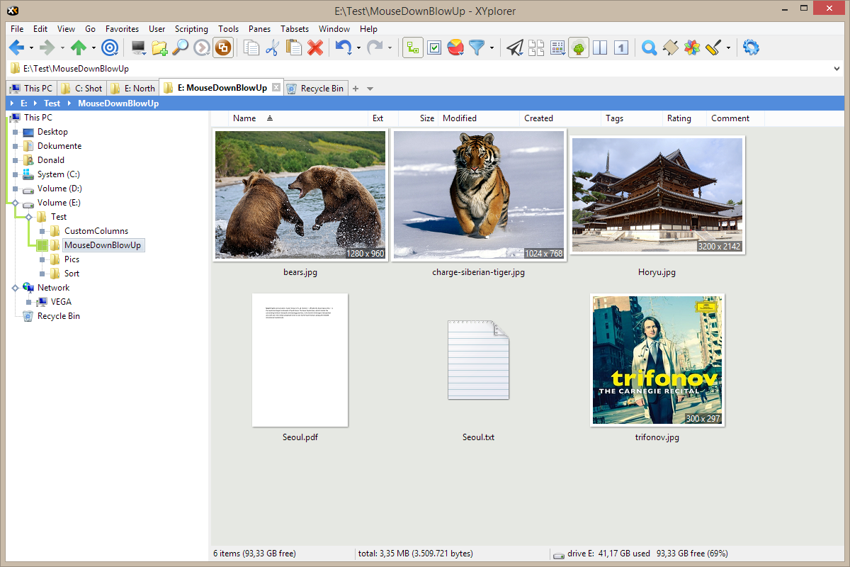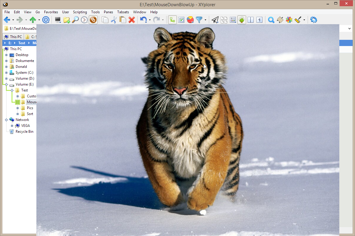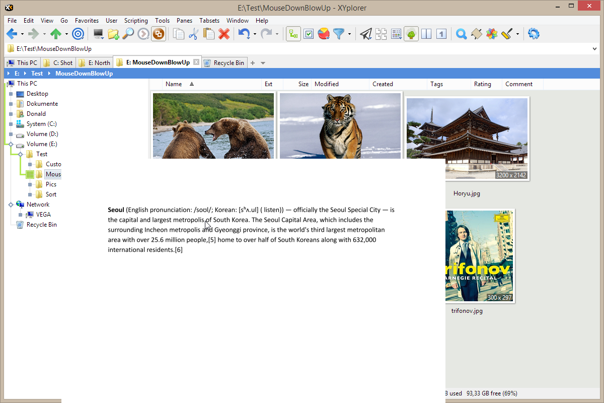 縮略圖、磁貼、文件圖標和圖片預覽都支援獨特的"滑鼠按下放大"功能:按住滑鼠左鍵在縮略圖(磁貼、圖標、預覽)上即可彈出原始大小的圖片。彈出窗口會精確放大到您按下滑鼠的位置。如果圖片大於屏幕,您可以在按住滑鼠的同時移動來平移。釋放滑鼠按鈕後彈出窗口消失。