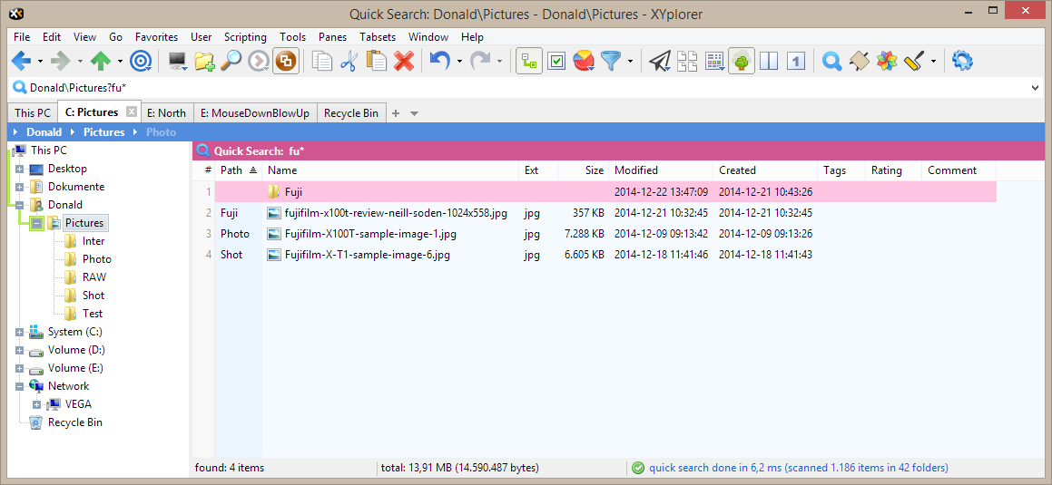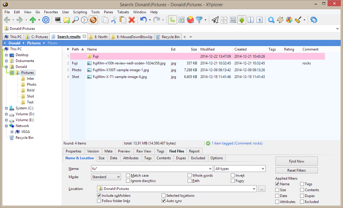 XYplorer 擁有強大的高端搜索引擎,具備驚人的搜索能力和速度。完全支援布爾邏輯、高級模式匹配、正則表達式、布爾正則表達式(任意數量正則表達式的布爾組合)、全詞匹配和模糊匹配、內容搜索(在文件內搜索文本字符串,支援通配符)、多位置搜索、重複文件查找器等。