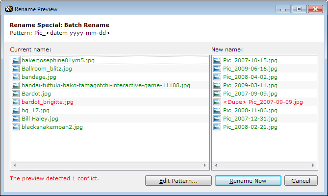 批次重新命名的重命名預覽。衝突會在為時已晚之前被檢測到。